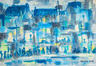 Unlike other dehumanizing descriptions by foreign journalists at the time, Yang’s watercolor work uses the warm glow of lights to illuminate the silhouettes of the shantytown inhabitants, going about their life against the backdrop of ramshackle houses rising up the slopes of the city’s hillsides, reflected in the waters of Pusan harbor. The unplanned movements of people shaped the nature of urban growth across this region as much if not more than the visions of planners and local boosters, and vestiges of them are still visible in the urban landscape today.